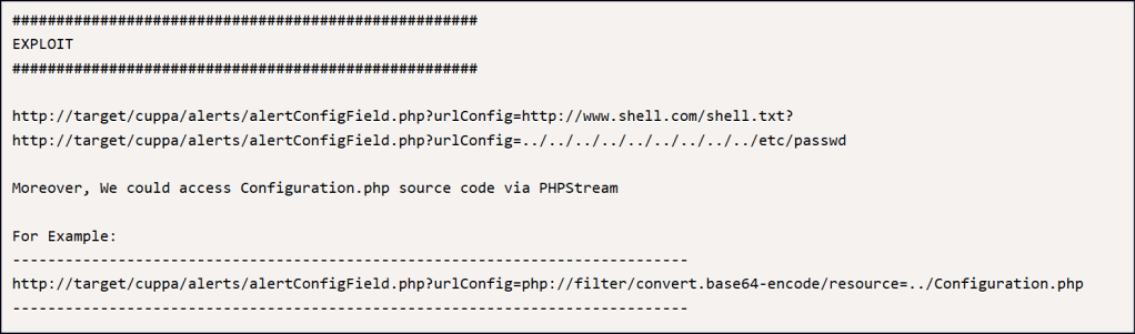 Cuppa CMS – ‘/alertConfigField.php’ Local/Remote File Inclusion – PHP webapps Exploit