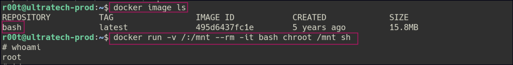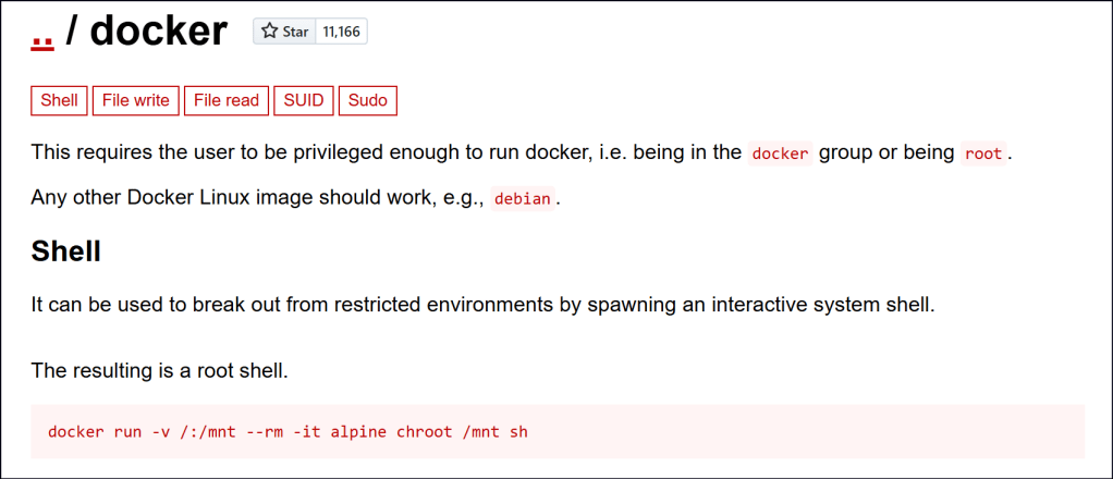 To escalate privileges, we first check the user’s ID and confirm their membership in the docker group. Using GTFOBins, we can find a method to spawn a root shell via Docker. Since the machine lacks internet access to pull new Docker images, we can list available images locally using the docker image ls command.