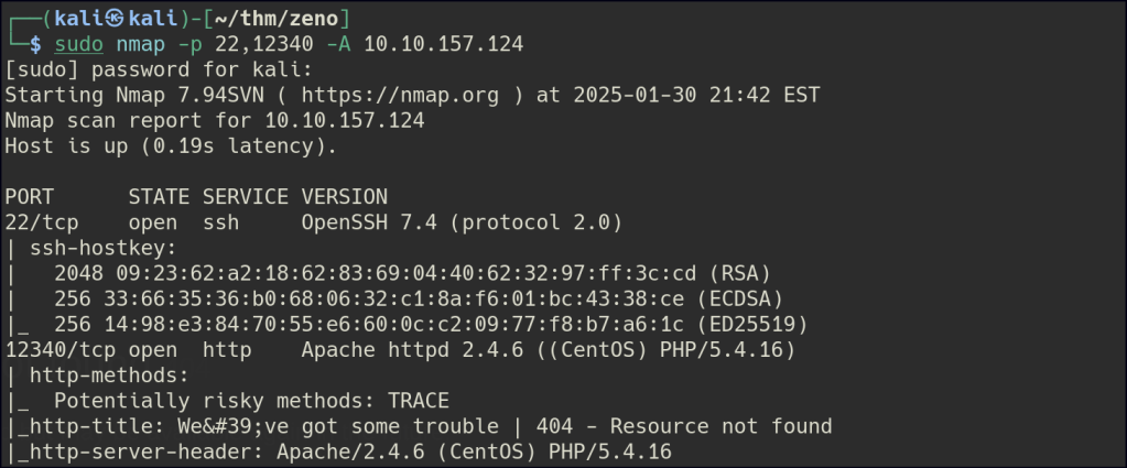 Start a nmap scan to dig into the open ports and add the necessary flags for in depth enumeration.