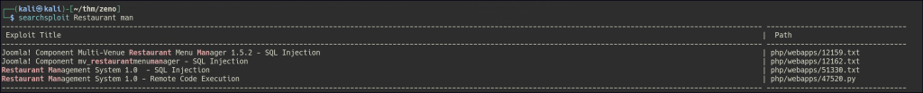 After spending some time enumerating the website and attempting various SQL injection techniques and bypass methods, I discovered that the site was a restaurant page. I proceeded to use searchsploit to look for potential vulnerabilities related to restaurant systems. During this search, I identified an exploit targeting a restaurant management system, which included a RCE vulnerability.