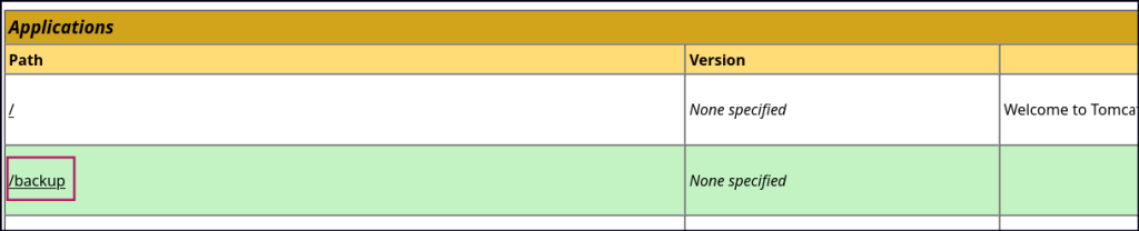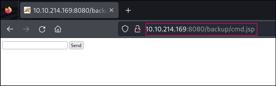 To deploy the .war file, click Browse to select the file and then click Deploy in the Tomcat Manager GUI. Once uploaded, the /backup application will appear in the table. To access the web shell, navigate to http://<IP>:8080/backup/cmd.jsp in your browser. This will load a web shell interface, allowing you to execute commands directly on the Tomcat server.