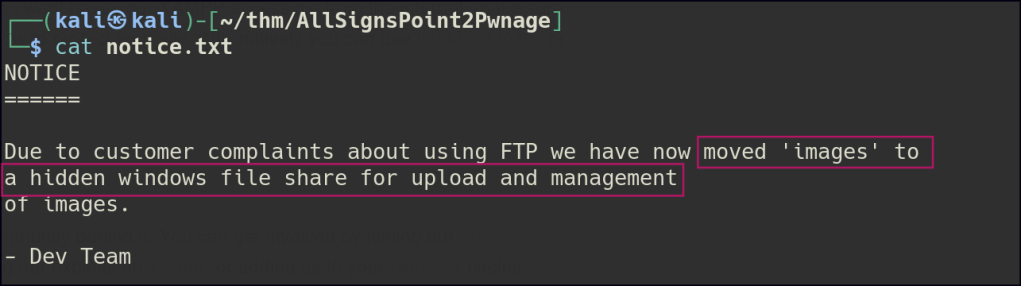 After running Nmap, I found that port 80 was open. I checked the website and saw it was displaying images. I then looked at the FTP service and found anonymous access with a file called notice.txt, which said images could be uploaded through a file share. Next, I checked the SMB shares and found one with read and write access, as well as another called installs that I couldn’t access.