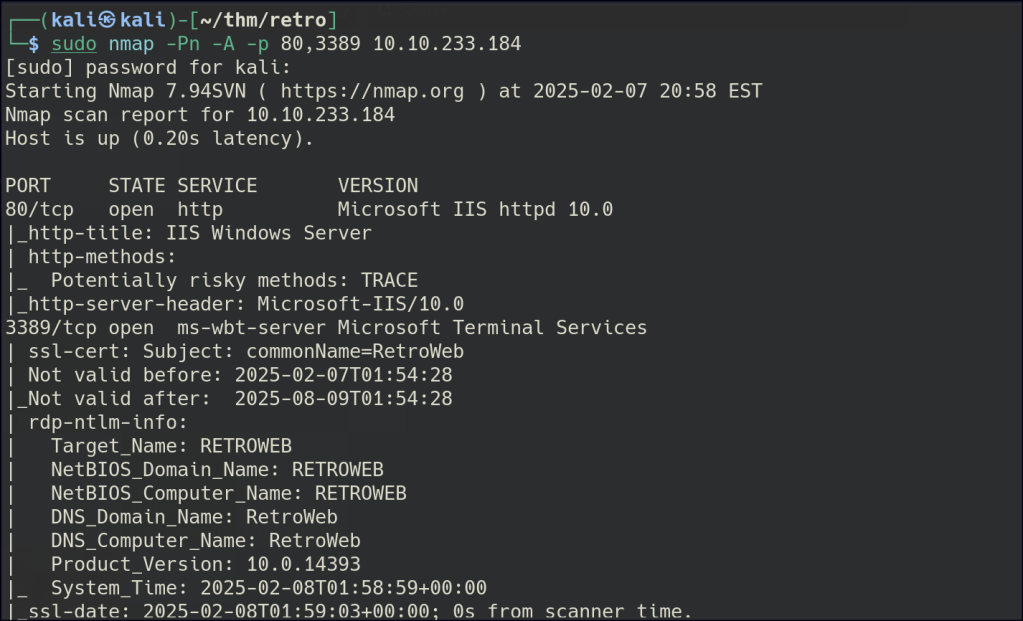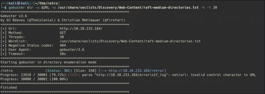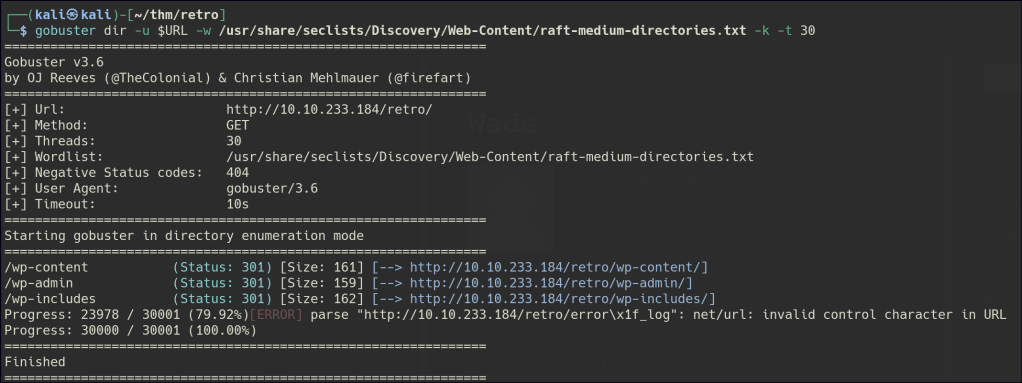 A hidden directory named “retro” is found, and further enumeration reveals it is a WordPress site.