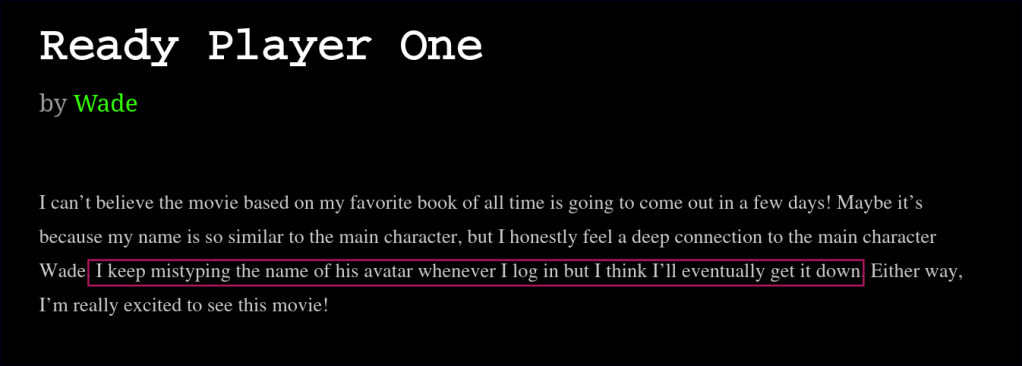 A clue in one of the blog posts suggests that the password might be the name of the protagonist’s avatar from the movie Ready Player One.