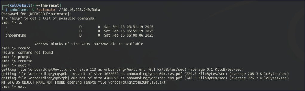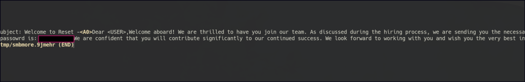 The Data Share folder is accessible to an anonymous user. Inside, there’s an onboarding folder that is continuously updating, preventing me from retrieving the file directly. However, using the more command in smbclient, I can view a .txt file containing passwords for new employees.