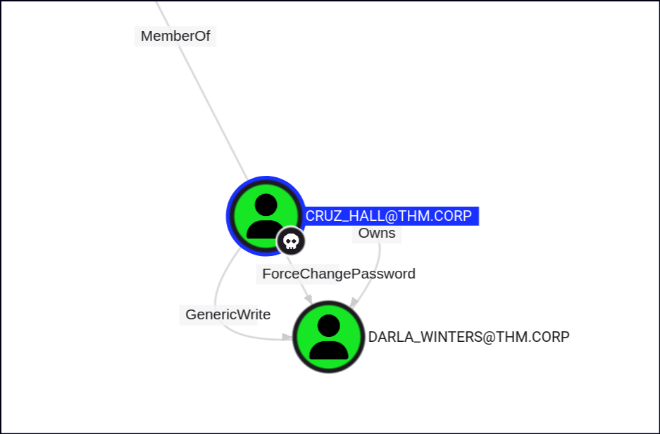 CRUZ_HALL also holds the ForceChangePassword privilege for DARLA_WINTERS, meaning they can reset the password for that account without needing the current one.
