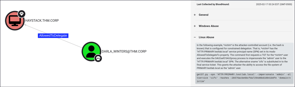 DARLA_WINTERS has the AllowedToDelegate permission on HAYSTACK.THM.CORP, meaning their account can impersonate other users when accessing resources on that system. This delegation allows the account to act on behalf of others, which can be exploited for privilege escalation if misconfigured.
