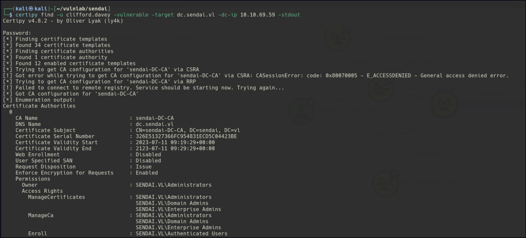 certipy find -u clifford.davey -vulnerable -target dc.sendai.vl -dc-ip 10.10.69.59 -stdout