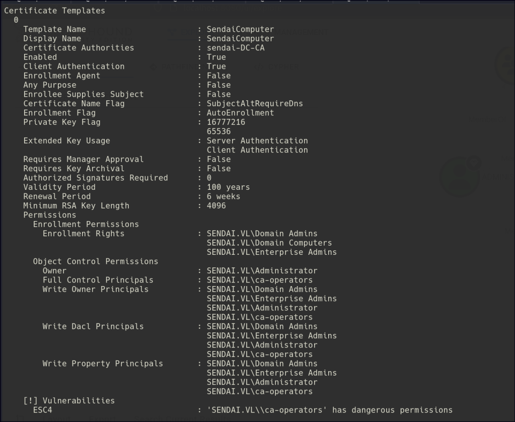 Next, you should identify certificate templates. Certipy helps identify certificate templates that may be vulnerable or allow for improper usage, such as those granting privileges like Domain Admin or Enterprise Admin when misconfigured.